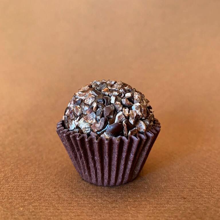 A soft & creamy 70% dark chocolate interior covered with cocoa nibs.
